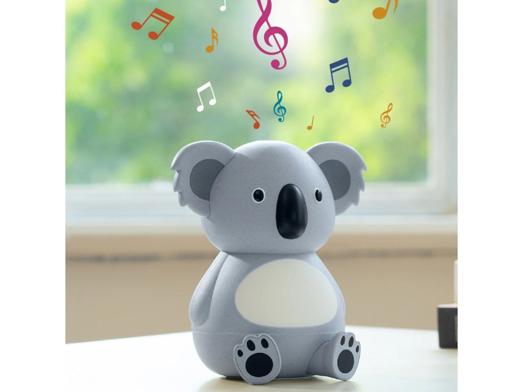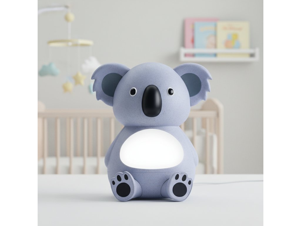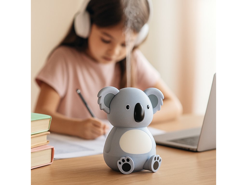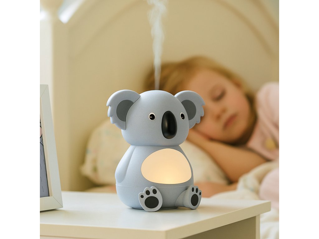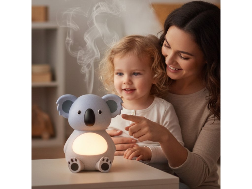 Koala formájú párologtató meleg fényű világítással és relaxációs hangokkal az esti rutinhoz.